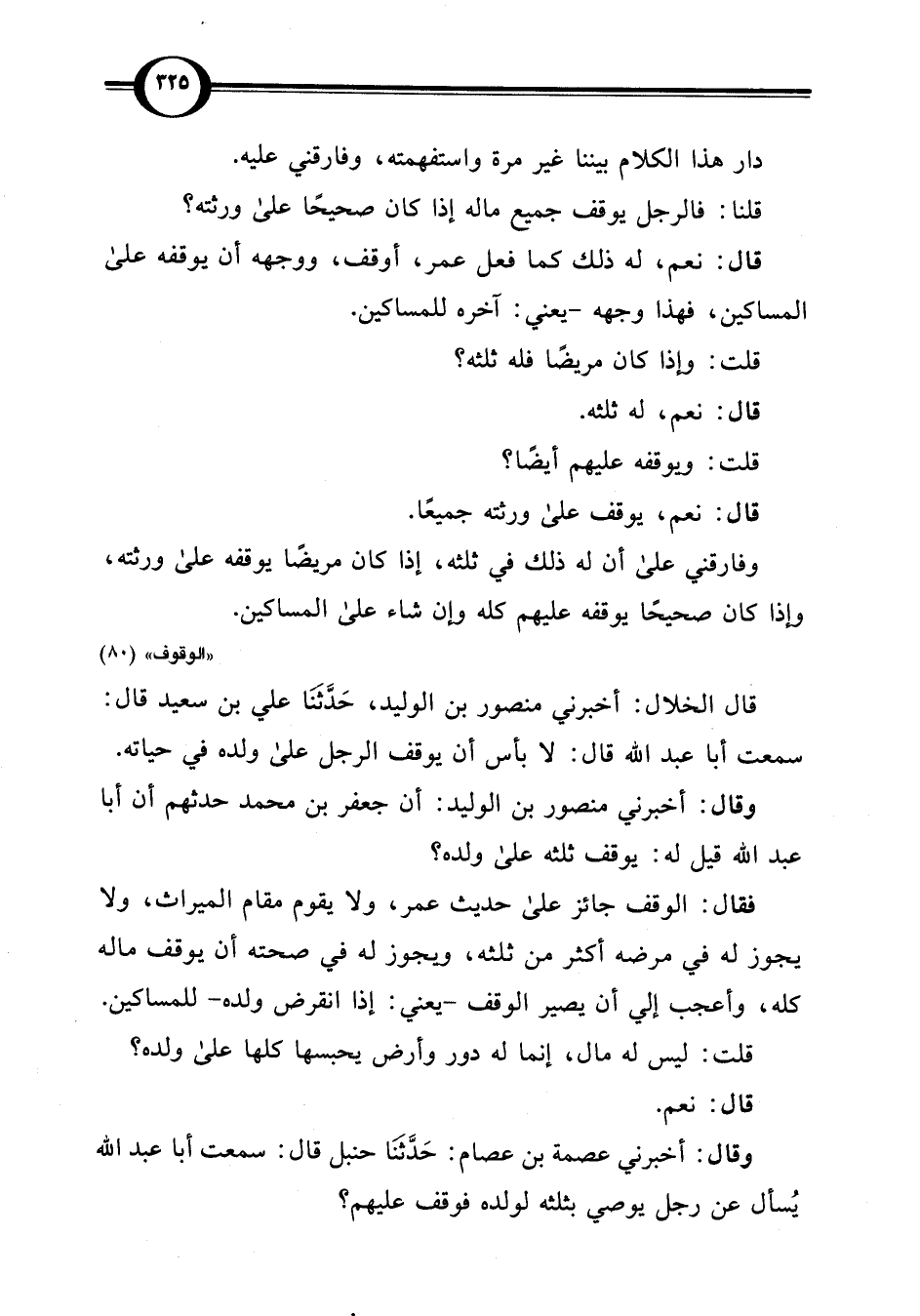وقال: أخبرني منصور بن الوليد: أن جعفر بن محمد حدثهم أن أبا عبد اللَّه قيل له: يوقف ثلثه على ولده؟