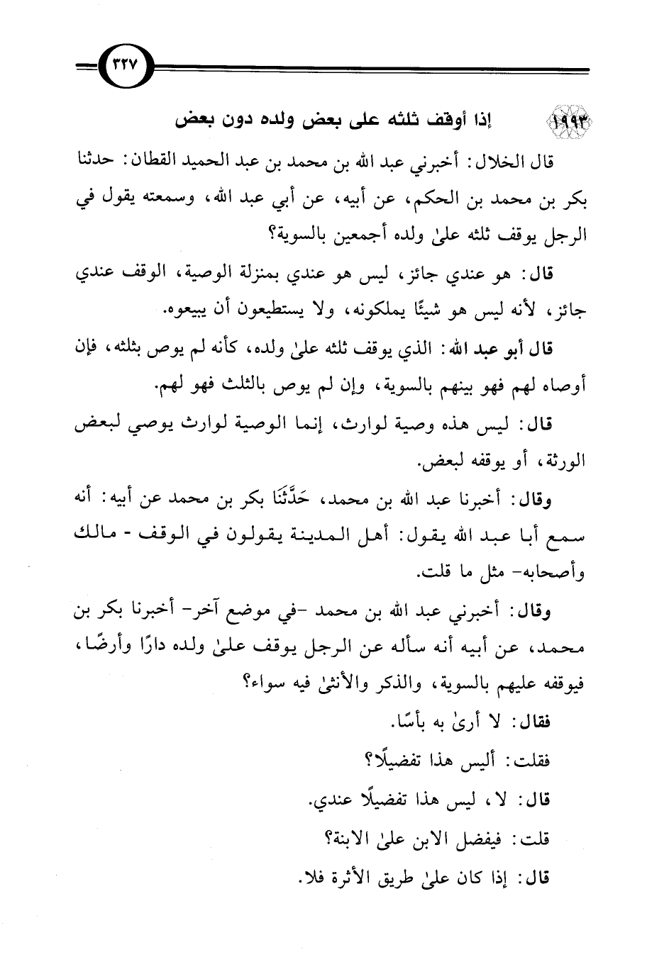 قال الخلال: أخبرني عبد اللَّه بن محمد بن عبد الحميد القطان: حدثنا بكر بن محمد بن الحكم، عن أبيه، عن أبي عبد اللَّه، وسمعته يقول في الرجل يوقف ثلثه على ولده أجمعين بالسوية؟