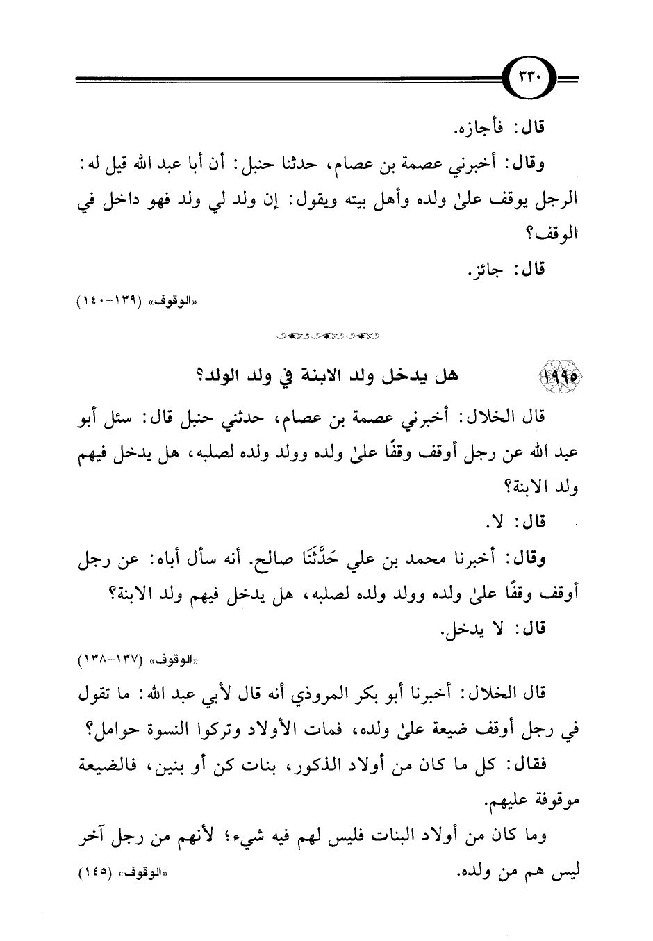 وقال: أخبرني عصمة بن عصام، حدثنا حنبل: أن أبا عبد اللَّه قيل له: الرجل يوقف على ولده وأهل بيته ويقول: إن ولد لي ولد فهو داخل في الوقف؟