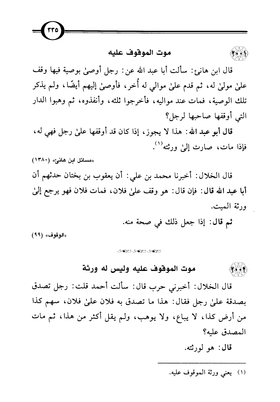 قال ابن هانئ: سألت أبا عبد اللَّه عن: رجل أوصى بوصية فيها وقف على مولى له، ثم قدم على موالي له أُخر، فأوصى إليهم أيضًا، ولم يذكر تلك الوصية، فمات عند مواليه، فأخرجوا ثلثه، وأنفذوه، ثم وهبوا الدار التي أوقفها صاحبها لرجل؟
