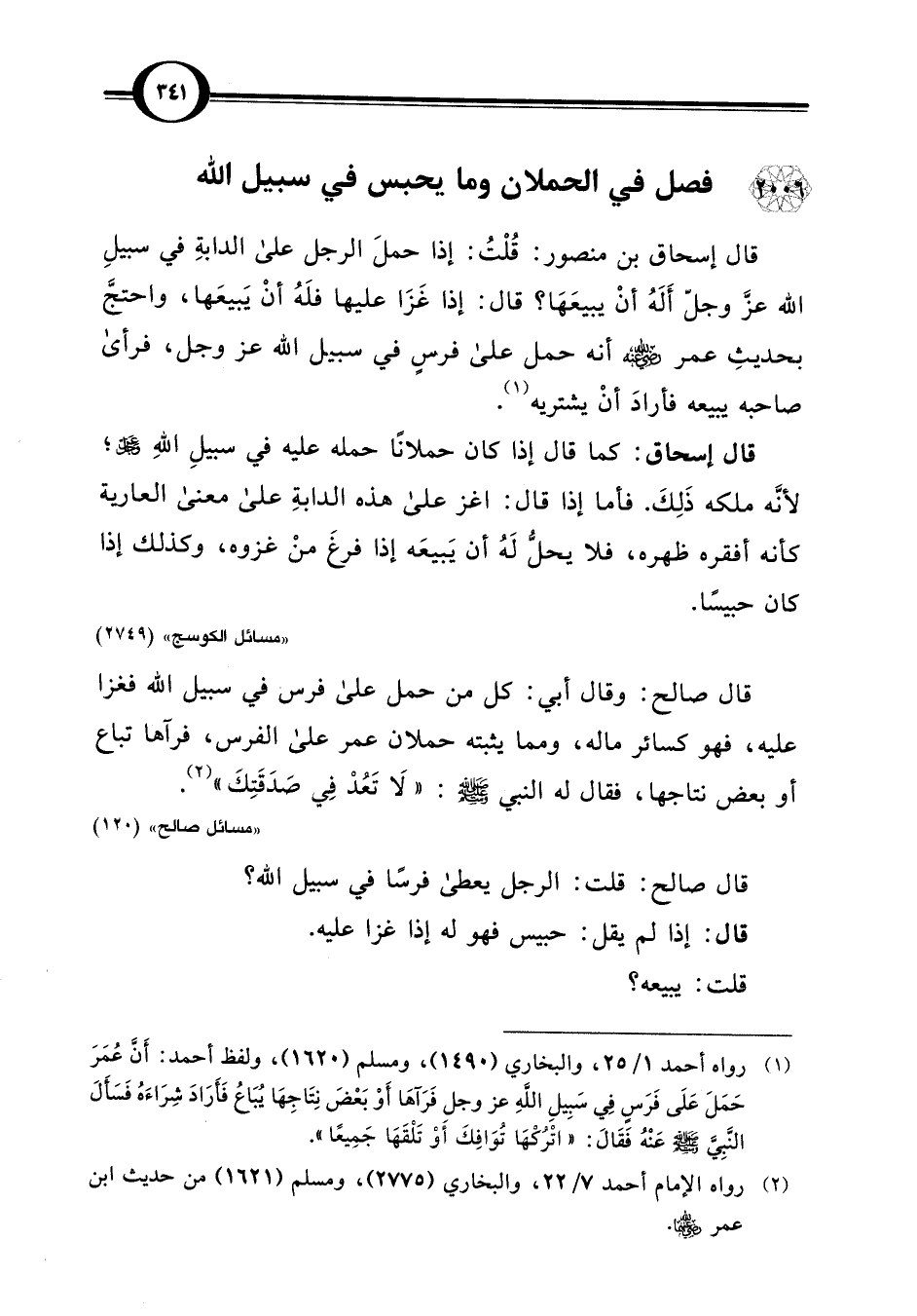 قال صالح: وقال أبي: كل من حمل على فرس في سبيل اللَّه فغزا عليه، فهو كسائر ماله، ومما يثبته حملان عمر على الفرس، فرآها تباع أو بعض نتاجها، فقال له النبي -صلى اللَّه عليه وسلم-: "لَا تَعُدْ فِي صَدَقَتِكَ" (¬2).