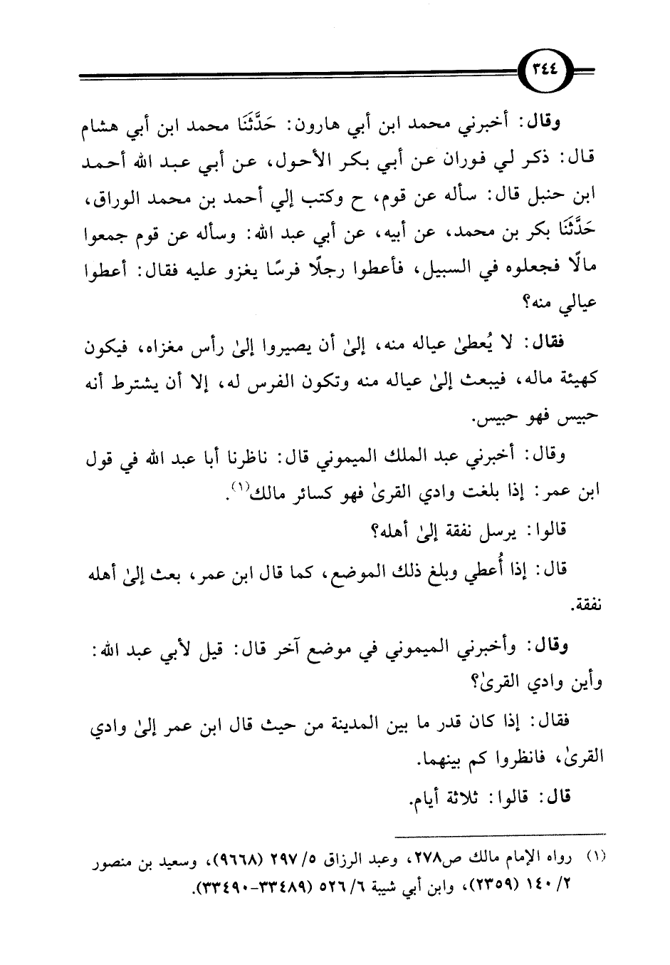 وقال: أخبرني محمد ابن أبي هارون: حَدَّثَنَا محمد ابن أبي هشام قال: ذكر لي فوران عن أبي بكر الأحول، عن أبي عبد اللَّه أحمد ابن حنبل قال: سأله عن قوم، ح وكتب إلى أحمد بن محمد الوراق، حَدَّثنَا بكر بن محمد، عن أبيه، عن أبي عبد اللَّه: وسأله عن قوم جمعوا مالًا فجعلوه في السبيل، فأعطوا رجلًا فرسًا يغزو عليه فقال أعطوا عيالي منه؟