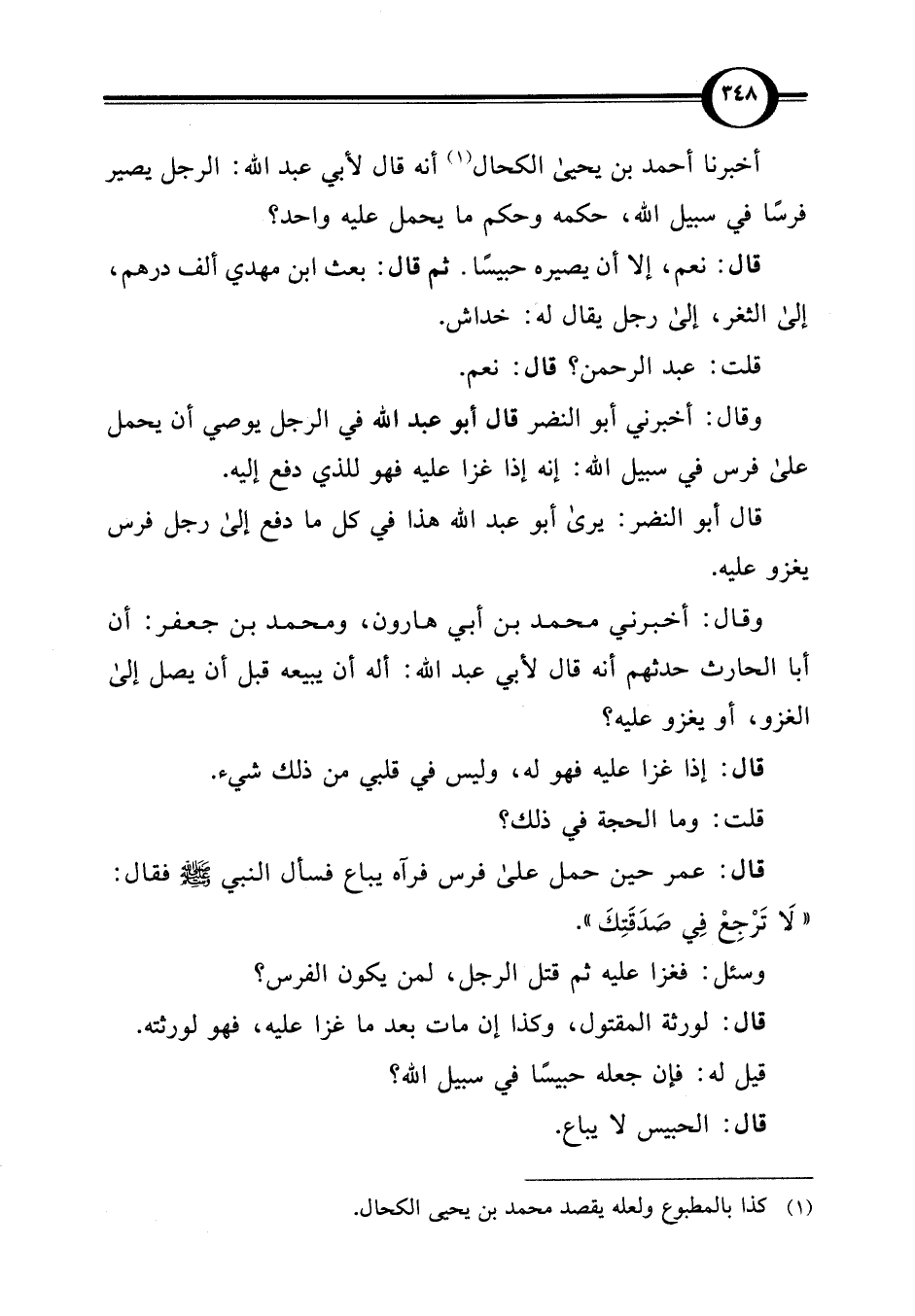 أخبرنا أحمد بن يحيى الكحال (¬1) أنه قال لأبي عبد اللَّه: الرجل يصير فرسًا في سبيل اللَّه، حكمه وحكم ما يحمل عليه واحد؟