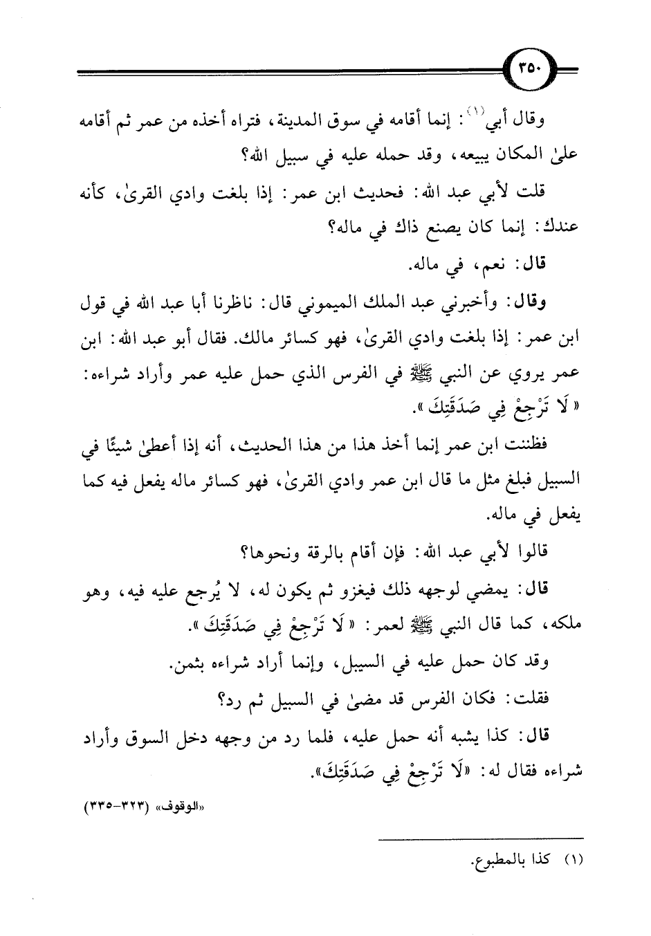 وقال: وأخبرني عبد الملك الميموني قال: ناظرنا أبا عبد اللَّه في قول ابن عمر: إذا بلغت وادي القرى، فهو كسائر مالك. فقال أبو عبد اللَّه: ابن عمر يروي عن النبي -صلى اللَّه عليه وسلم- في الفرس الذي حمل عليه عمر وأراد شراءه: "لَا تَرْجِعْ فِي صَدَقَتِكَ".
