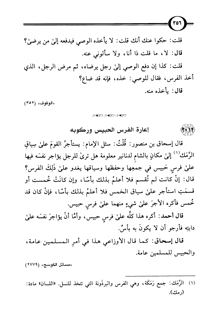 قال إسحاق بن منصور: قُلْتُ: سئل الإمام: يستأجرُ القومَ على سِياقِ الرَّمَك (¬1) إلى مكالغ بالشامِ لدنانير معلومة هل ترى للرجل يؤاجر نفسَه فيها على فرسٍ حَبيس في جمعِها وحفظها وسياقها يغدو على ذَلِكَ الفرس؟ قال: إنْ كانت لم تُقسم فلا أعلمُ بذلك بأسًا، وإن كانَتْ خُمست أو قسمَتِ استأجر على سياق الخمس فلا أعلمُ بذلك بأسًا، فإنْ كان قد خُمس فأكره الأجرَ على شيء منهما على فرسٍ حبيس.