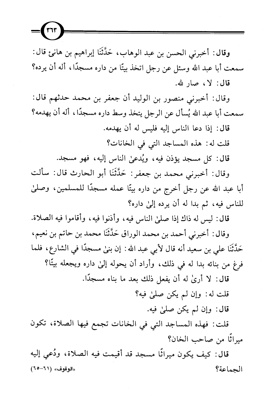 وقال: أخبرني الحسن بن عبد الوهاب، حَدَّثَنَا إبراهيم بن هانئ قال: سمعت أبا عبد اللَّه وسئل عن رجل اتخذ بيتًا من داره مسجدًا، أله أن يرده؟