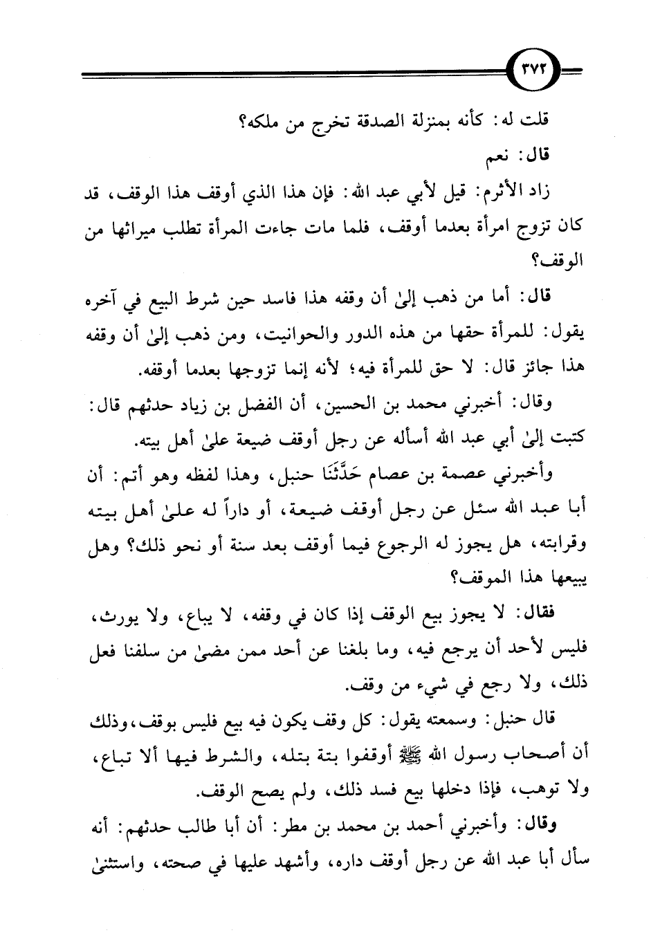 قال حنبل: وسمعته يقول: كل وقف يكون فيه بيع فليس بوقف، وذلك أن أصحاب رسول اللَّه -صلى اللَّه عليه وسلم- أوقفوا بتة بتله، والشرط فيها ألا تباع، ولا توهب، فإذا دخلها بيع فسد ذلك، ولم يصح الوقف.