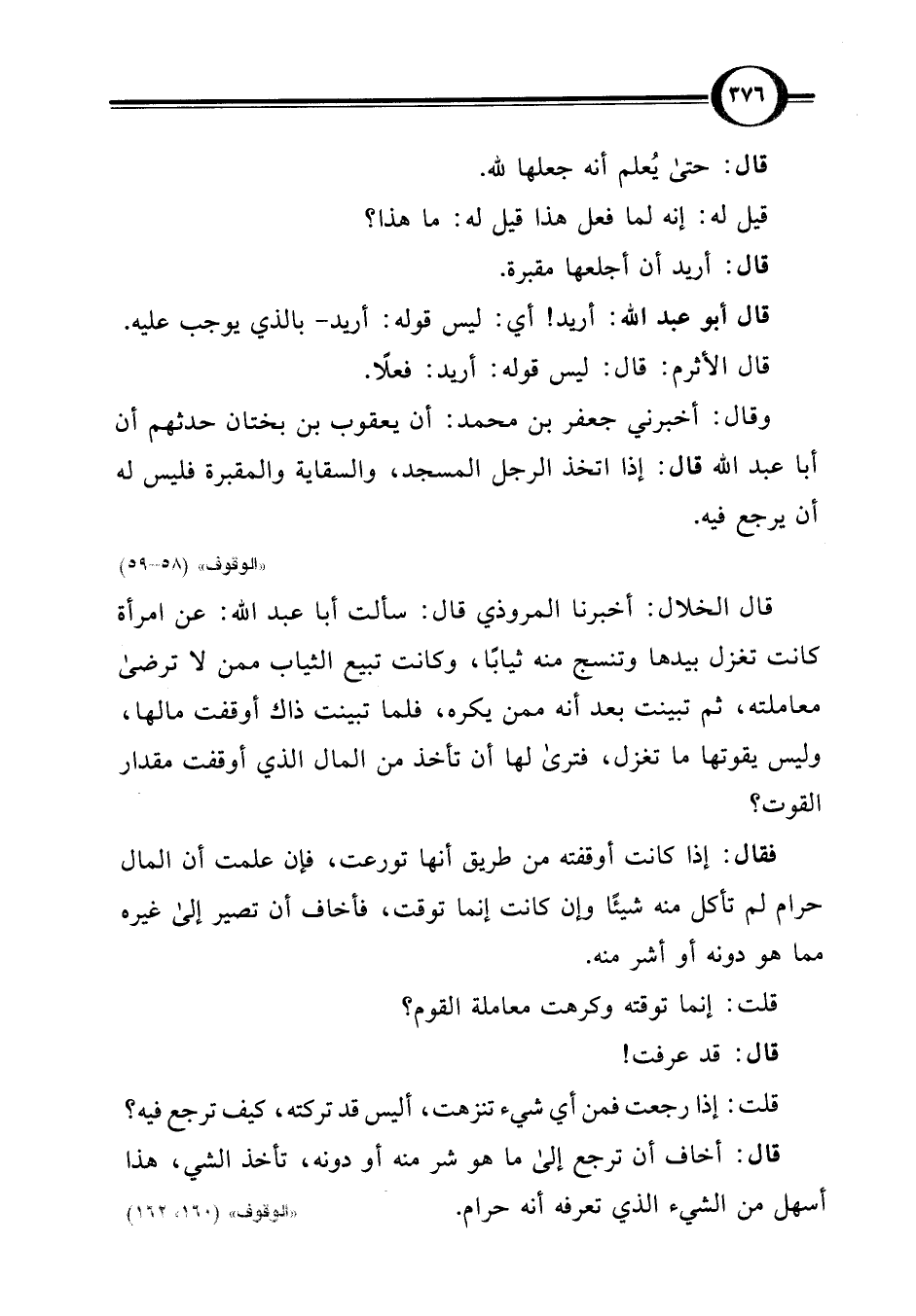 وقال: أخبرني جعفر بن محمد: أن يعقوب بن بختان حدثهم أن أبا عبد اللَّه قال: إذا اتخذ الرجل المسجد، والسقاية والمقبرة فليس له أن يرجع فيه.
