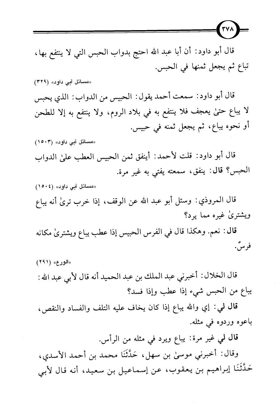 قال أبو داود: سمعت أحمد يقول: الحبيس من الدواب: الذي يحبس لا يباع حتى يعجف فلا ينتفع به في بلاد الروم، ولا ينتفع به إلا للطحن أو نحوه يباع، ثم يجعل ثمنه في حبيس.