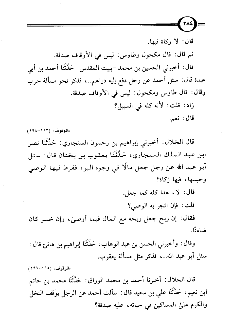 قال: أخبرني الحسين بن محمد -ببيت المقدس- حَدَّثنَا أحمد بن أبي عبدة قال: سئل أحمد عن رجل دفع إليه دراهم. .، فذكر نحو مسألة حرب وقال: قال طاوس ومكحول: ليس في الأوقاف صدقة.