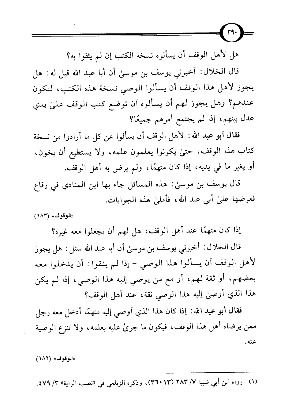 فقال أبو عبد اللَّه: لأهل الوقف أن يسألوا عن كل ما أرادوا من نسخة كتاب هذا الوقف، حتى يكونوا يعلمون علمه، ولا يستطيع أن يخون، أو يغير ما في يديه، إذا كان متهمًا، ولم يرض به أهل الوقف.