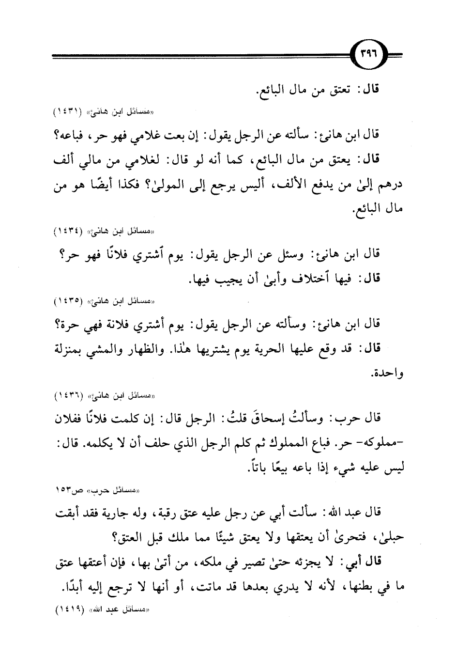 قال حرب: وسألتُ إسحاقَ قلتُ: الرجل قال: إن كلمت فلانًا ففلان -مملوكه- حر. فباع المملوك ثم كلم الرجل الذي حلف أن لا يكلمه. قال: ليس عليه شيء إذا باعه بيعًا باتًا.