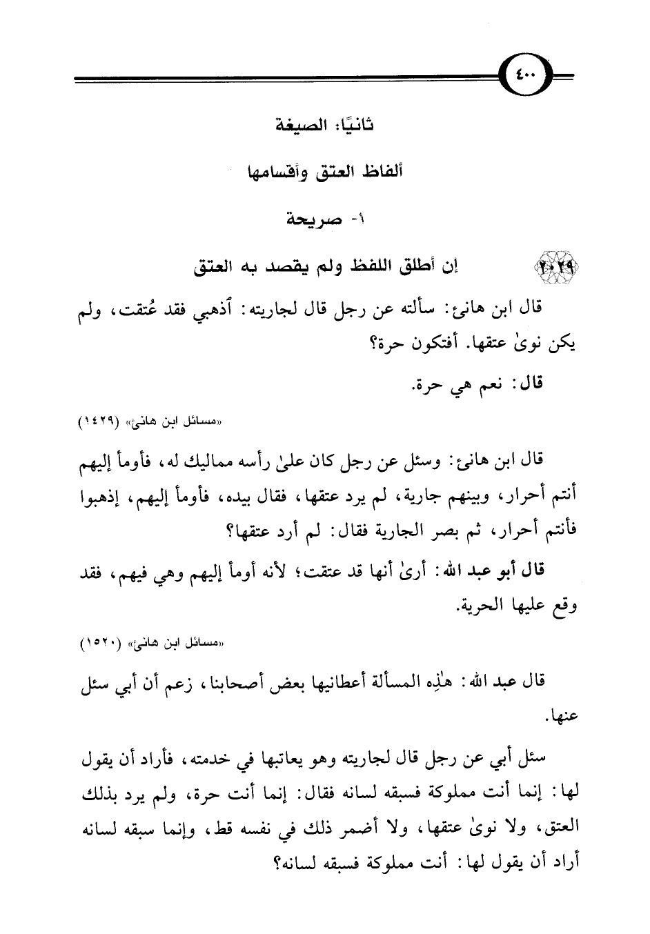 قال ابن هانئ: وسئل عن رجل كان علي رأسه مماليك له، فأومأ إليهم أنتم أحرار، وبينهم جارية، لم يرد عتقها، فقال بيده، فأومأ إليهم، إذهبوا فأنتم أحرار، ثم بصر الجارية فقال: لم أرد عتقها؟