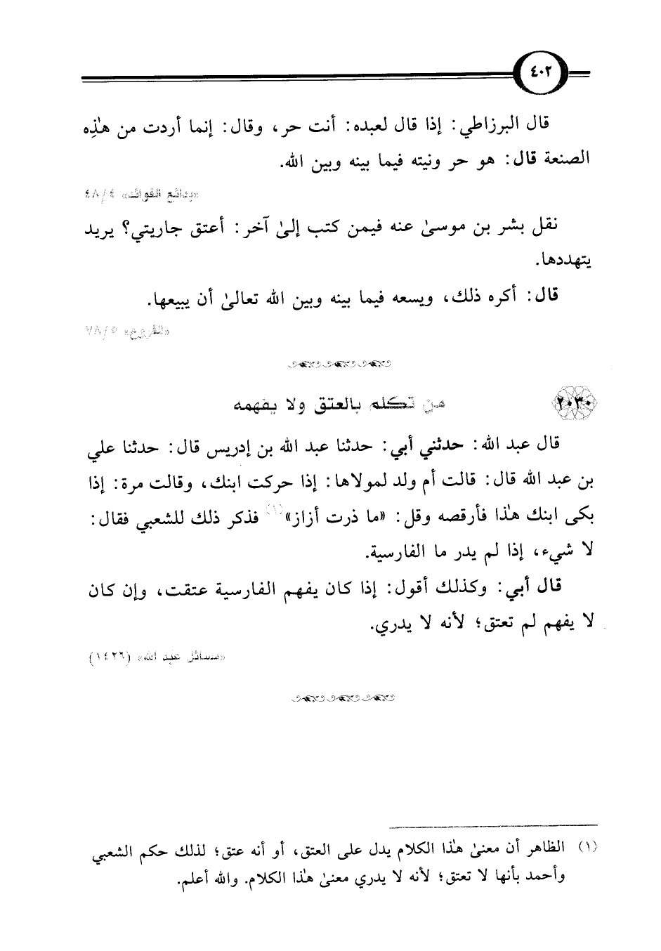 (¬1) الظاهر أن معنى هذا الكلام يدل على العتق، أو أنه عتق؛ لذلك حكم الشعبي وأحمد بأنها لا تعتق؛ لأنه لا يدري معنى هذا الكلام. واللَّه أعلم.