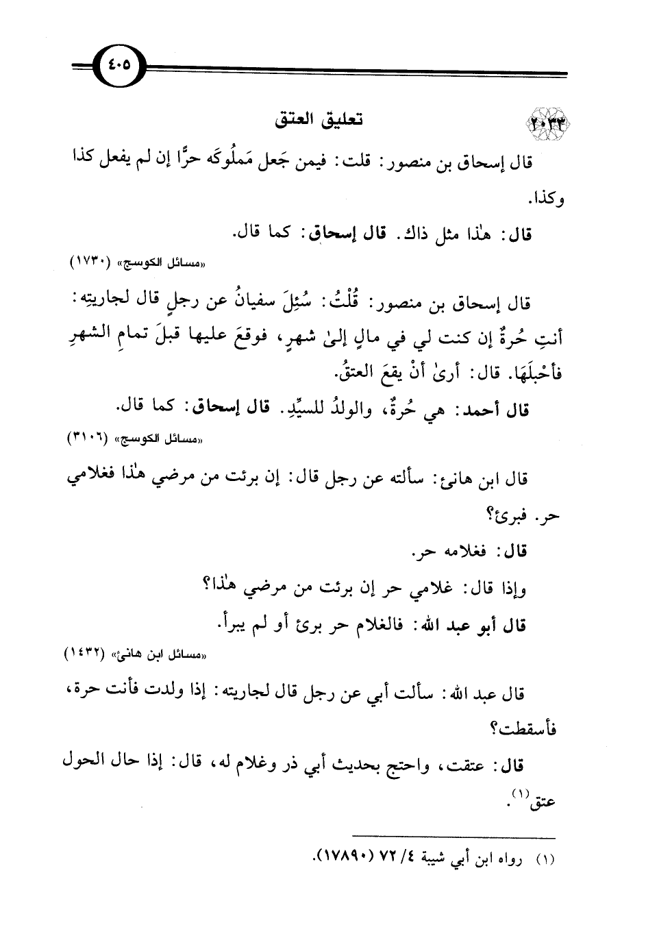 قال إسحاق بن منصور: قلت: فيمن جَعل مَملُوكَه حرًّا إن لم يفعل كذا وكذا.
