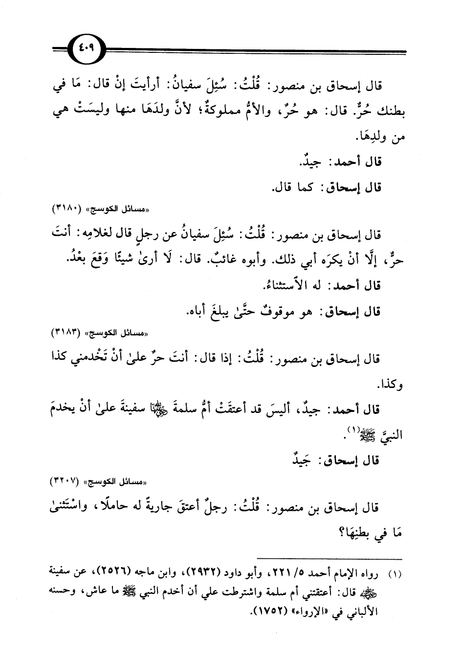 قال أحمد: جيدٌ، أليسَ قد أعتقَتْ أمُّ سلمةَ -رضي اللَّه عنها- سفينةَ على أنْ يخدمَ النبيَّ -صلى اللَّه عليه وسلم- (¬1).