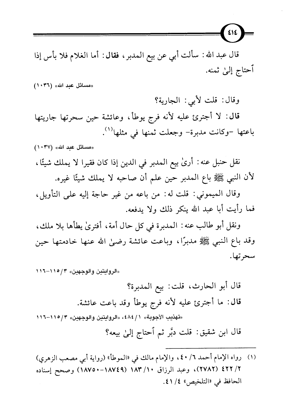 قال عبد اللَّه: سألت أبي عن بيع المدبر، فقال: أما الغلام فلا بأس إذا أحتاج إلى ثمنه.