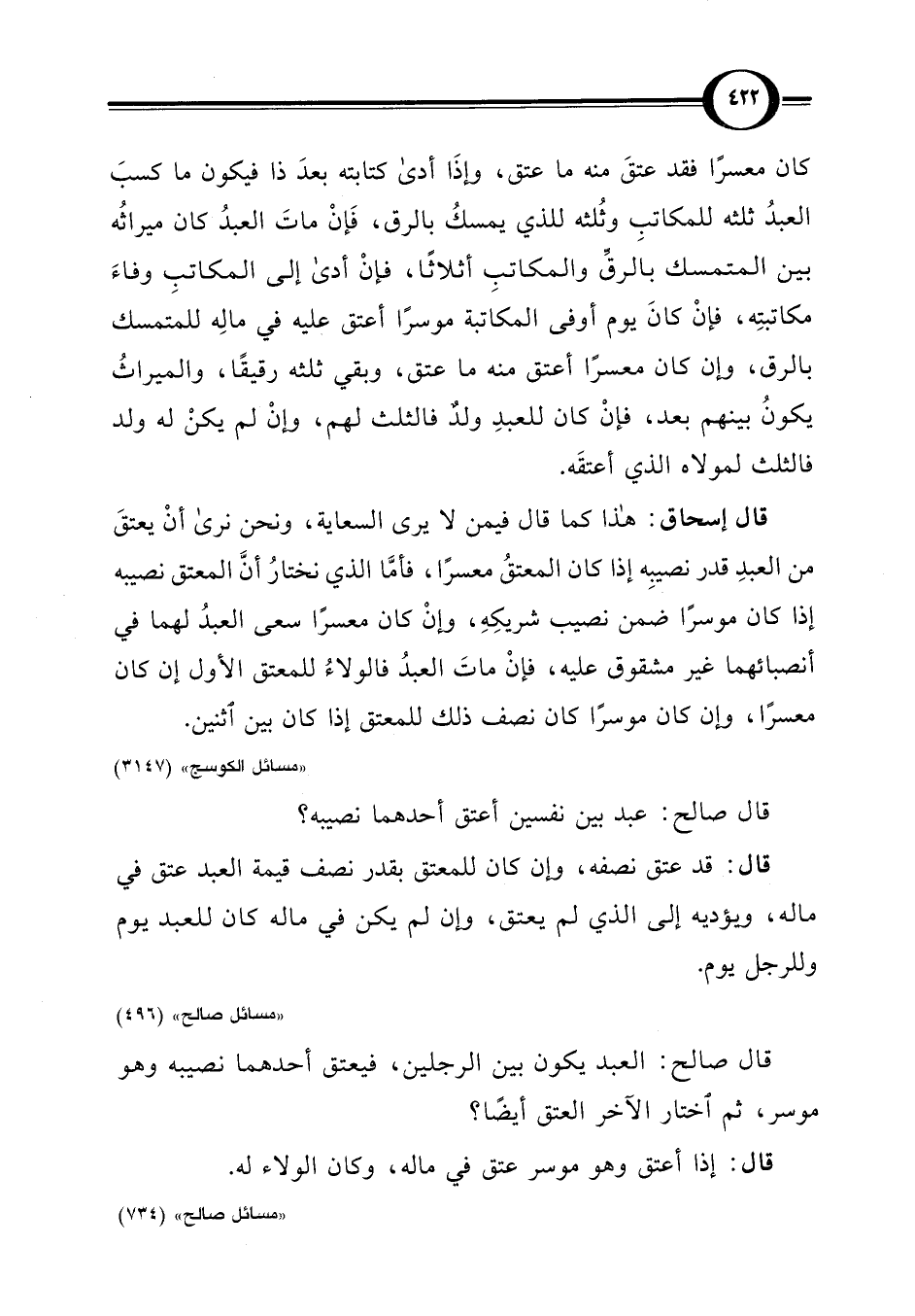 كان معسرًا فقد عتقَ منه ما عتق، وإذَا أدى كتابته بعدَ ذا فيكون ما كسبَ العبدُ ثلثه للمكاتبِ وثُلثه للذي يمسكُ بالرق، فَإنْ ماتَ العبدُ كان ميراثُه بين المتمسك بالرقِّ والمكاتبِ أثلاثًا، فإنْ أدى إلى المكاتبِ وفاءَ مكاتبتِه، فإنْ كانَ يوم أوفى المكاتبة موسرًا أعتق عليه في مالِه للمتمسك بالرق، وإن كان معسرًا أعتق منه ما عتق، وبقي ثلثه رقيقًا، والميراثُ يكونُ بينهم بعد، فإنْ كان للعبدِ ولدٌ فالثلث لهم، وإنْ لم يكنْ له ولد فالثلث لمولاه الذي أعتقَه.