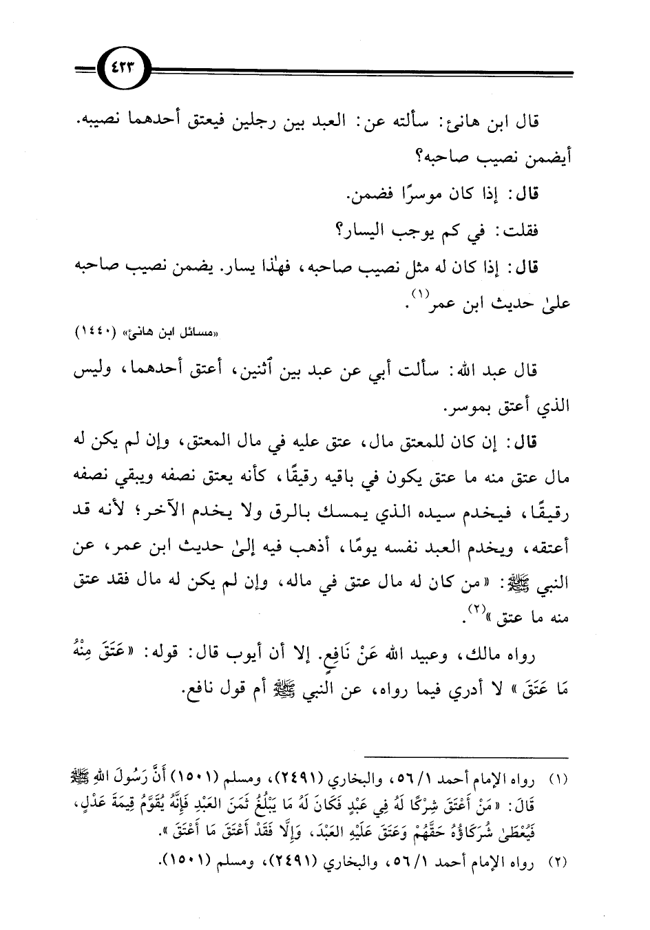 (¬1) رواه الإمام أحمد 1/ 56، والبخاري (2491)، ومسلم (1501) أَنَّ رَسُولَ اللَّهِ -صلى اللَّه عليه وسلم- قَالَ: "مَنْ أَعْتَقَ شِرْكًا لَهُ في عَبْدٍ فَكَانَ لَهُ مَا يَبْلُغُ ثَمَنَ العَبْدِ فَإِنَّهُ يُقَوَّمُ قِيمَةَ عَدْلٍ، فَيُعْطَى شُرَكَاؤُهُ حَقَّهُمْ وَعَتَقَ عَلَيْهِ العَبْدَ، وَإِلَّا فَقَدْ أَعْتَقَ مَا أَعْتَقَ".