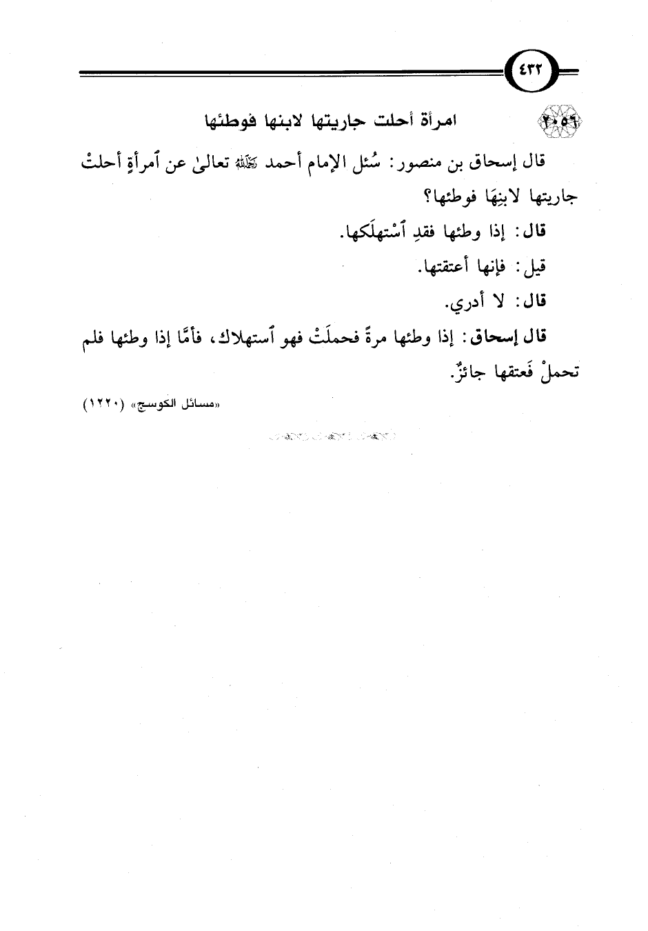 قال إسحاق بن منصور: سُئل الإمام أحمد رحمهُ اللَّه تعالى عن امرأةٍ أحلتْ جاريتها لابنِهَا فوطئها؟