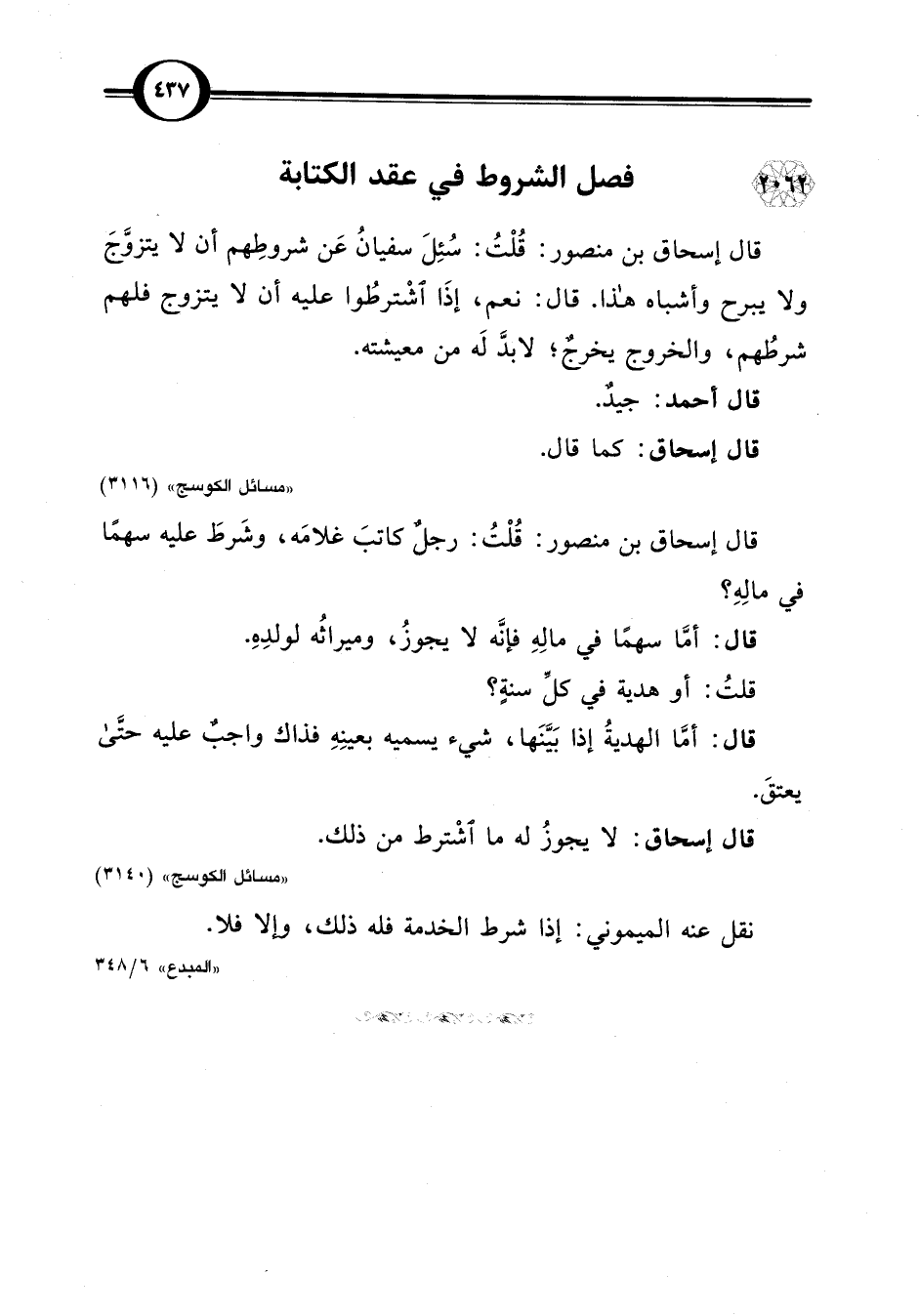 قال إسحاق بن منصور: قُلْتُ: رجلٌ كاتبَ غلامَه، وشَرطَ عليه سهمًا في مالِهِ؟