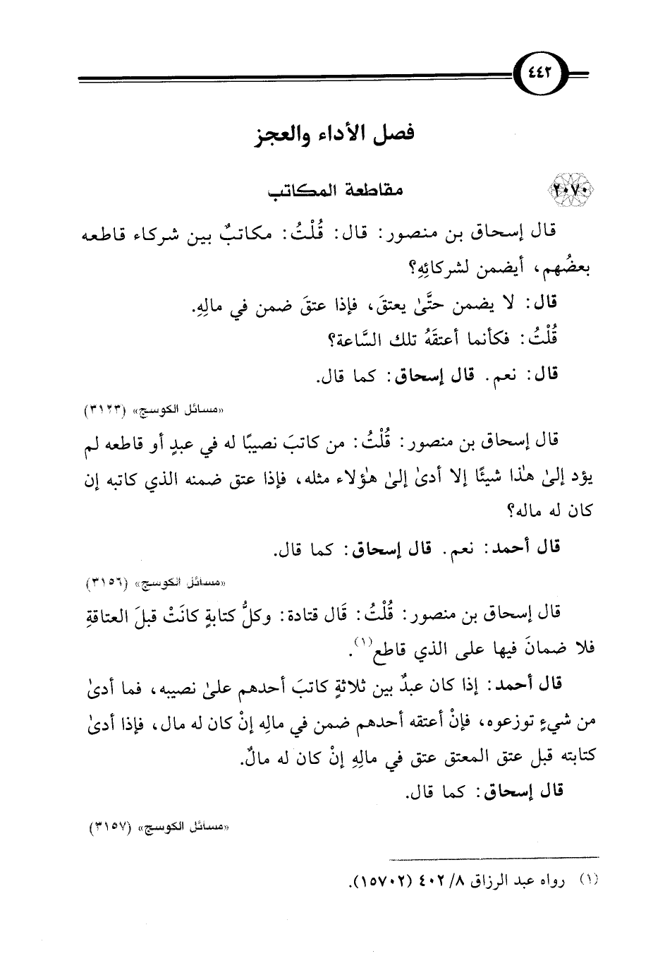 قال إسحاق بن منصور: قُلْتُ: من كاتبَ نصيبًا له في عبدٍ أو قاطعه لم يؤد إلى هذا شيئًا إلا أدى إلى هؤلاء مثله، فإذا عتق ضمنه الذي كاتبه إن كان له ماله؟