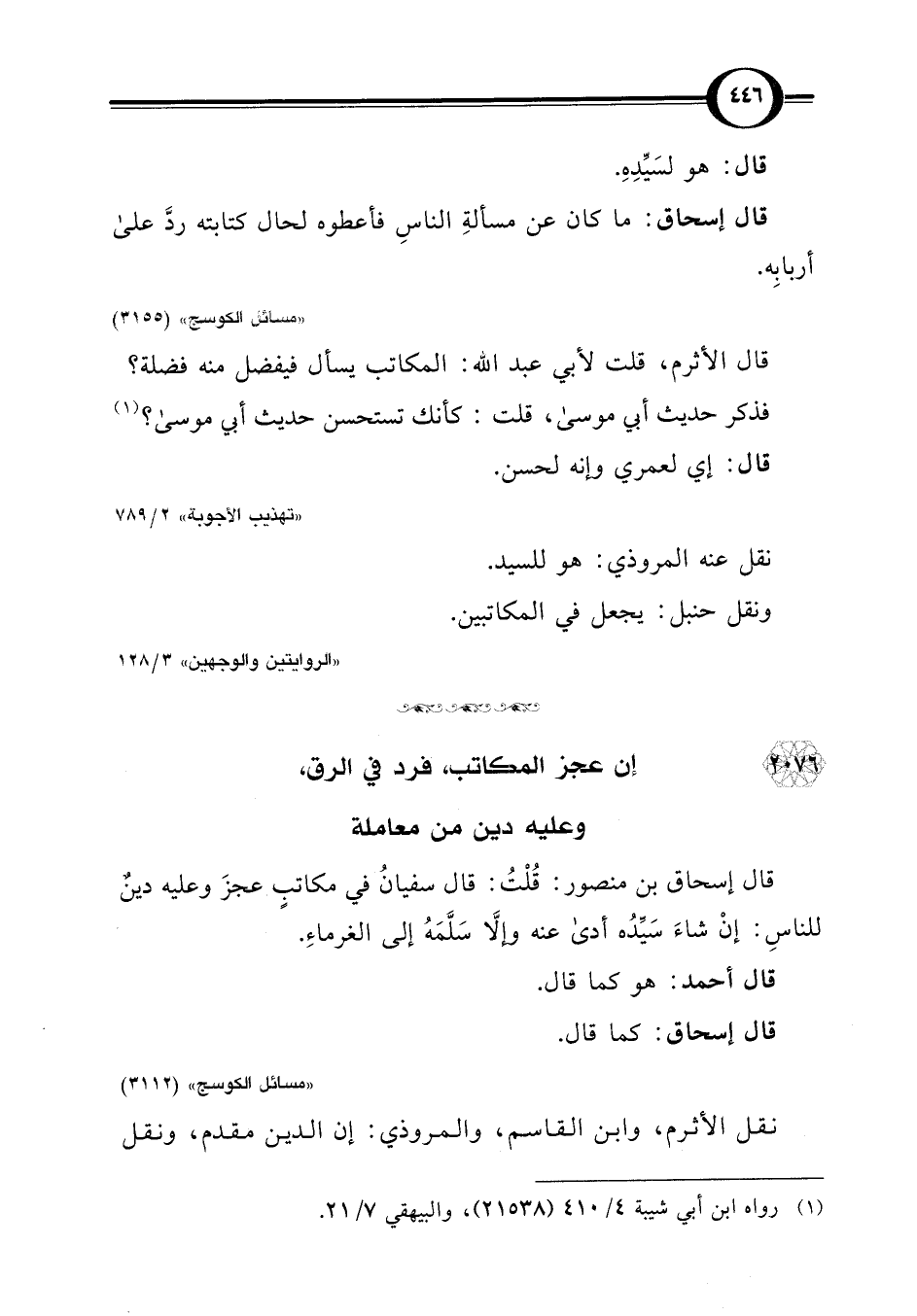 قال إسحاق بن منصور: قُلْتُ: قال سفيانُ في مكاتبٍ عجزَ وعليه دينٌ للناسِ: إنْ شاءَ سَيِّدُه أدى عنه وإلَّا سَلَّمَهُ إلى الغرماءِ.