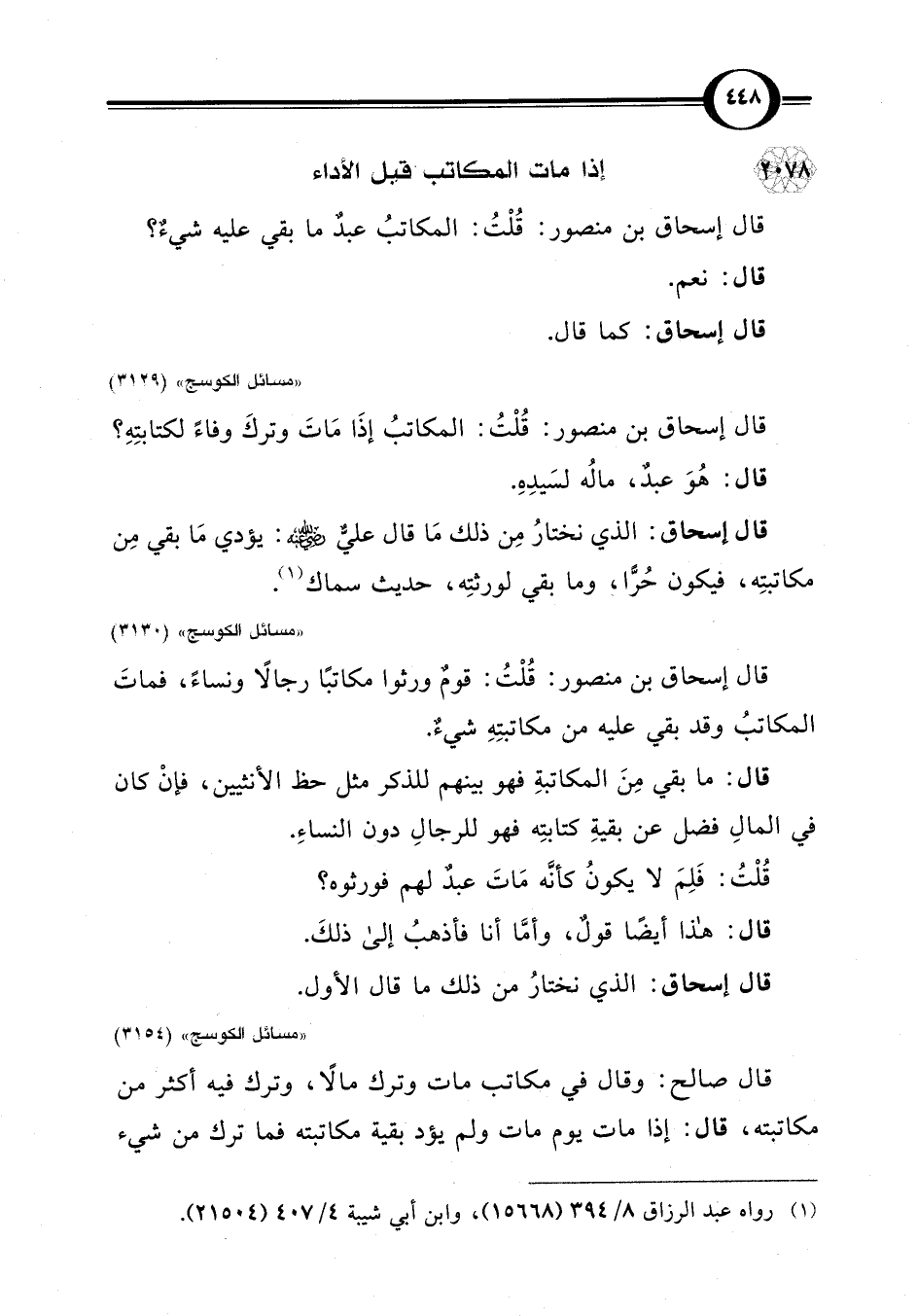 قال إسحاق بن منصور: قُلْتُ: قومٌ ورثوا مكاتبًا رجالًا ونساءً، فماتَ المكاتبُ وقد بقي عليه من مكاتبتِهِ شيءٌ.