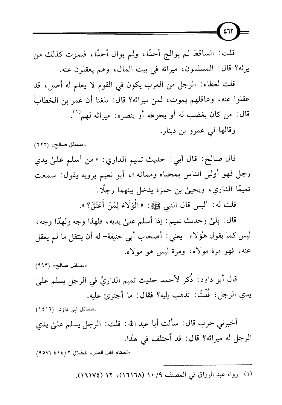 قال أبو داود: ذُكر لأحمد حديث تميم الداريِّ في الرجل يسلم على يدي الرجل؛ قُلْتُ: تذهب إليه؟ فقال: ما أجترئ عليه.