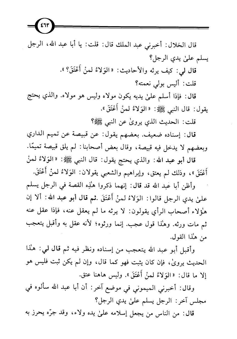 وأظن أبا عبد اللَّه قد قال: إنهما ذكروا هذِه القصة في الرجل يسلم على يدي الرجل قالوا: الوَلاءُ لمنْ أعْتَقَ. ثم قال أبو عبد اللَّه: ألا إن هؤلاء أصحاب الرأي يقولون: لا يرثه ما لم يعقل عنه، فإذا عقل عنه ثم مات ورثه. وهذا قول عجب. إنما ورثوه؛ لأنه عقل به وأقبل يتعجب من هذا القول.