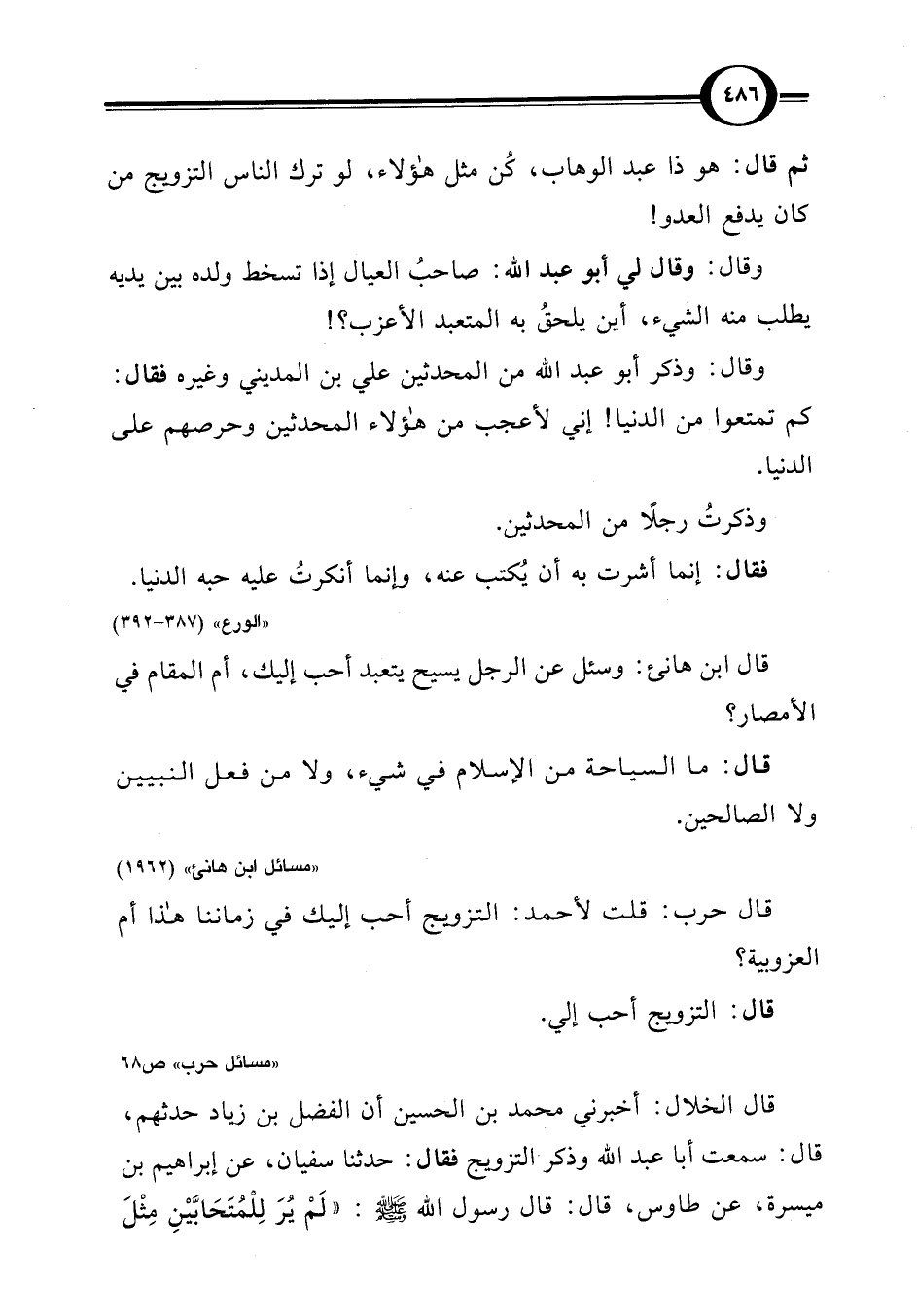 قال حرب: قلت لأحمد: التزويج أحب إليك في زماننا هذا أم العزوبية؟