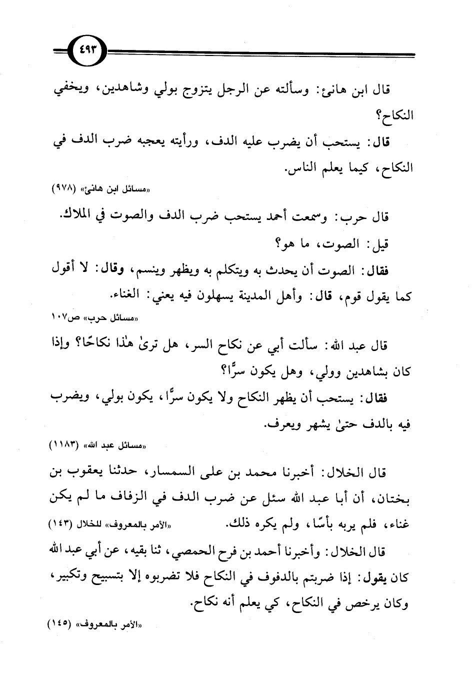 قال الخلال: وأخبرنا أحمد بن فرح الحمصي، ثنا بقيه، عن أبي عبد اللَّه كان يقول: إذا ضربتم بالدفوف في النكاح فلا تضربوه إلا بتسبيح وتكبير، وكان يرخص في النكاح، كي يعلم أنه نكاح.