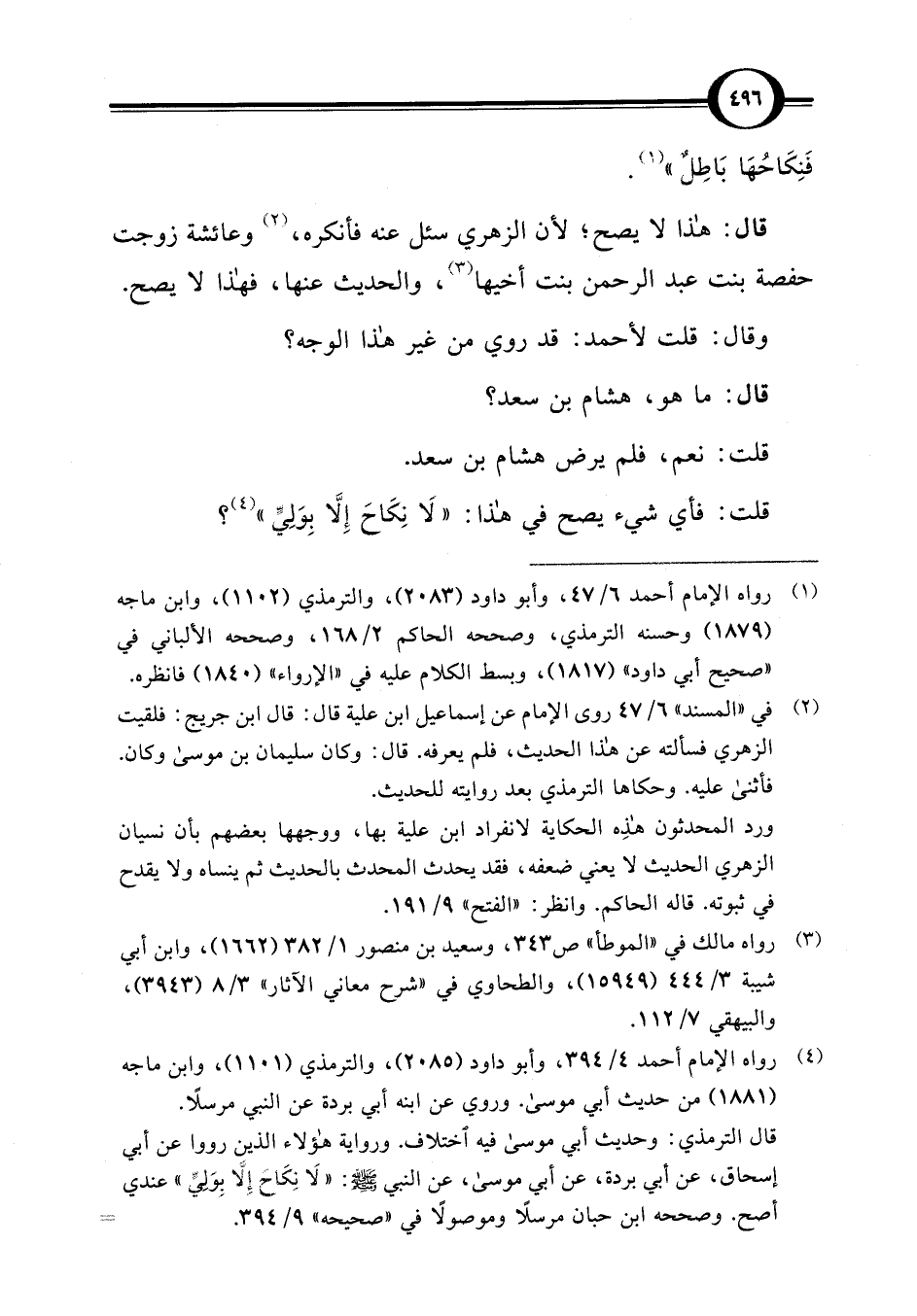 قال: هذا لا يصح؛ لأن الزهري سئل عنه فأنكره، (¬2) وعائشة زوجت حفصة بنت عبد الرحمن بنت أخيها (¬3)، والحديث عنها، فهذا لا يصح.