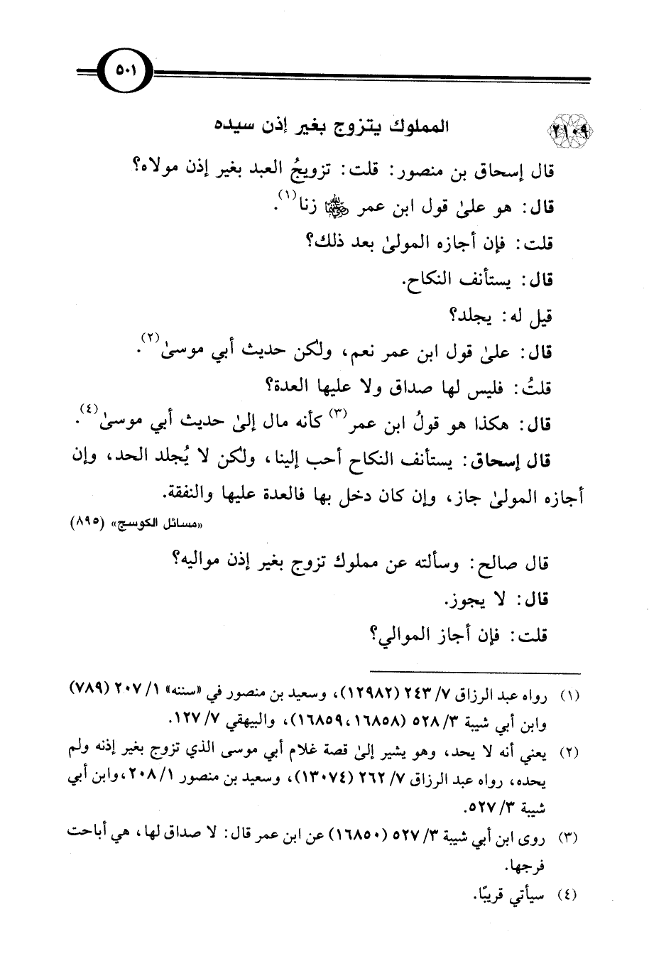 قال إسحاق بن منصور: قلت: تزويجُ العبد بغير إذن مولاه؟