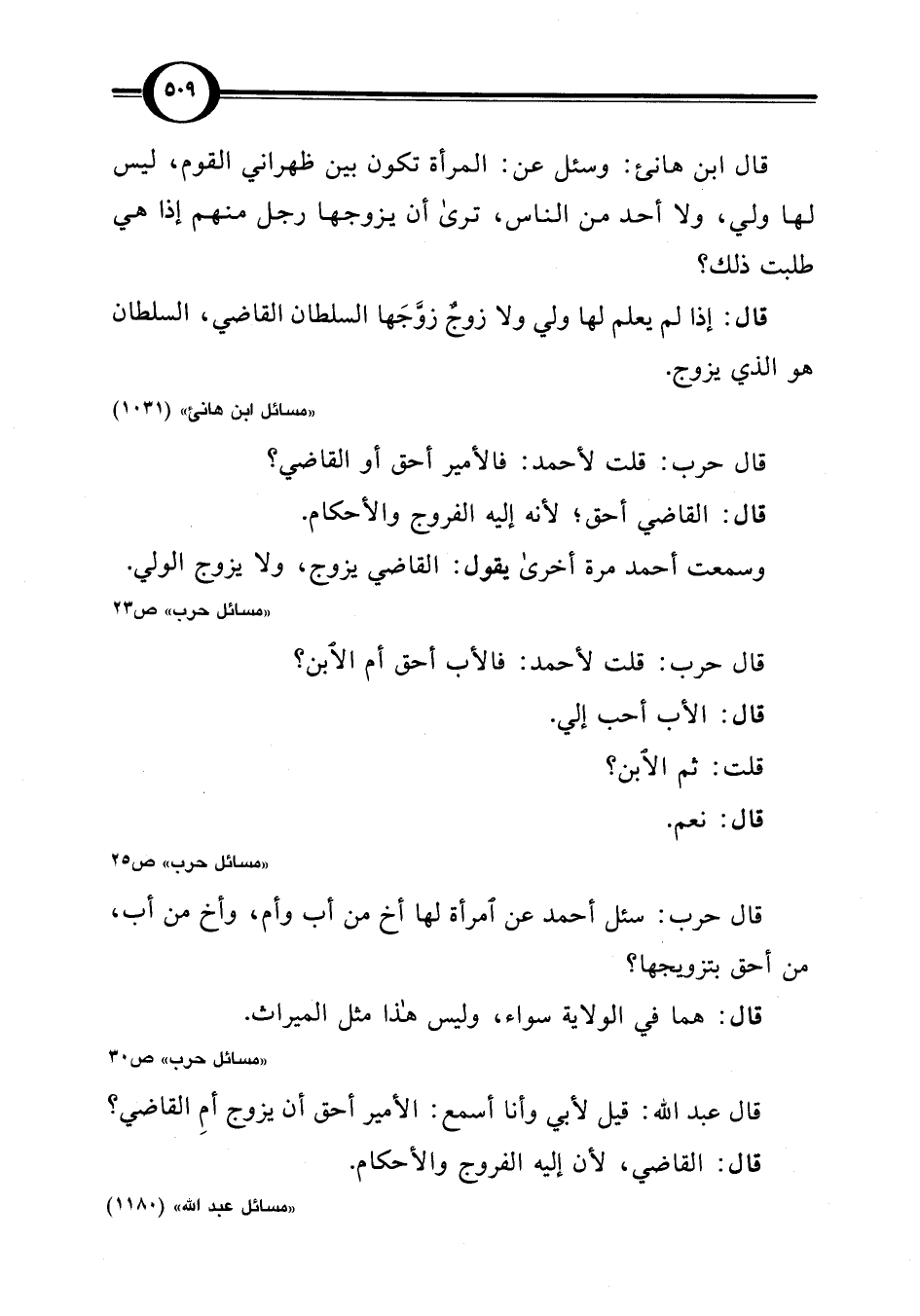 قال عبد اللَّه: قيل لأبي وأنا أسمع: الأمير أحق أن يزوج أمِ القاضي؟ قال: القاضي، لأن إليه الفروج والأحكام.