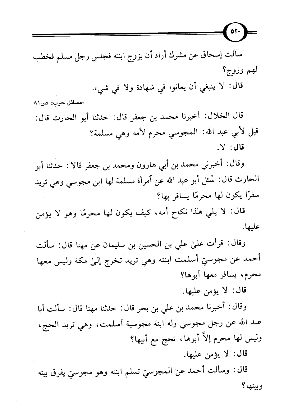 وقال: أخبرنا محمد بن علي بن بحر قال: حدثنا مهنا قال: سألت أبا عبد اللَّه عن رجل مجوسي وله ابنة مجوسية أسلمت، وهي تريد الحج، وليس لها محرم إلَّا أبوها، تحج مع أبيها؟