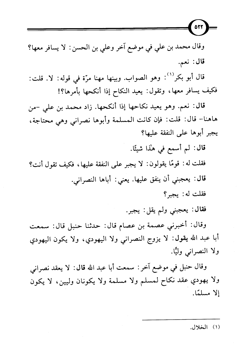 وقال: أخبرني عصمة بن عصام قال: حدثنا حنبل قال: سمعت أبا عبد اللَّه يقول: لا يزوج النصراني ولا اليهودي، ولا يكون اليهودي ولا النصراني وليًّا.