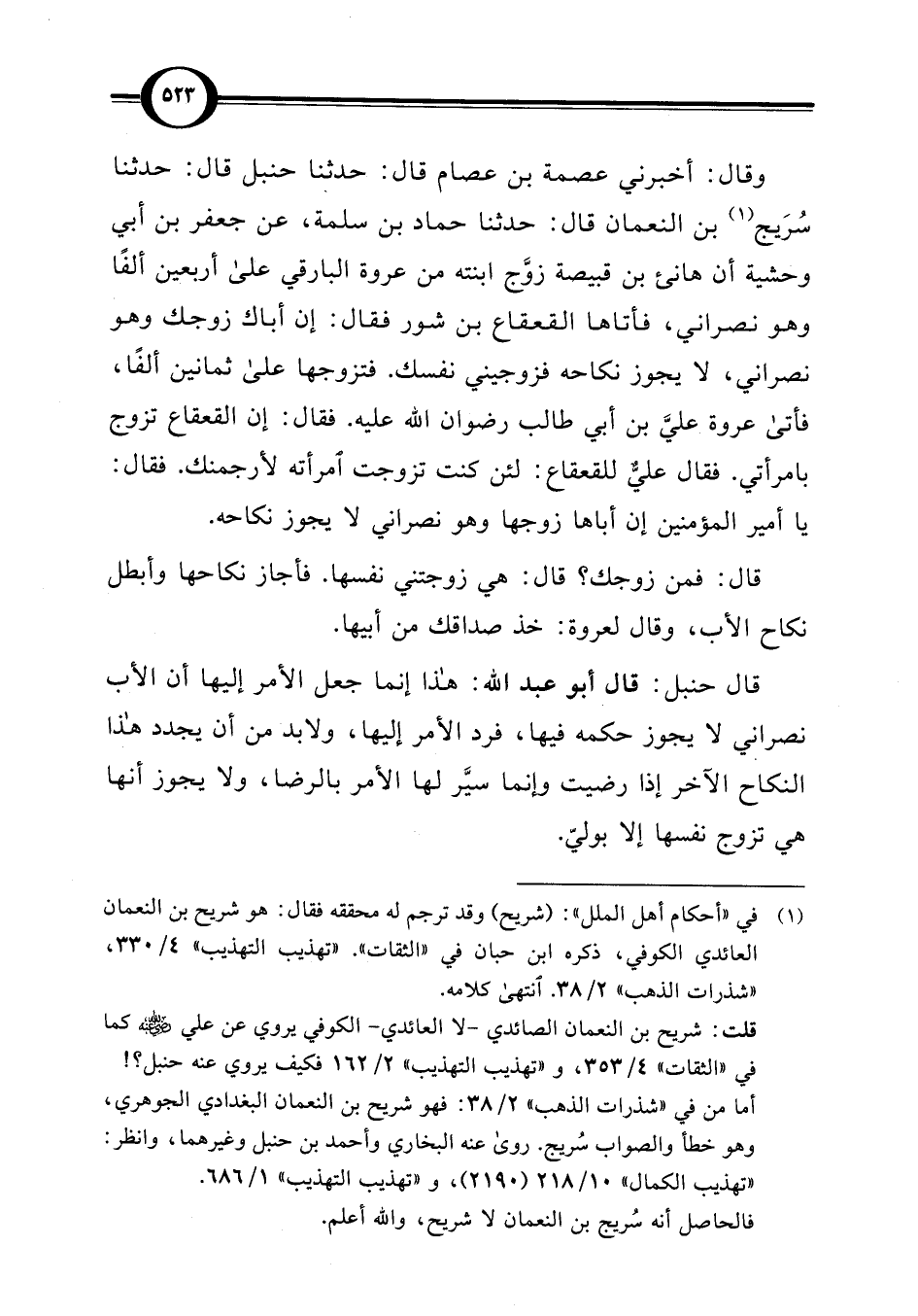 (¬1) في "أحكام أهل الملل": (شريح) وقد ترجم له محققه فقال: هو شريح بن النعمان العائدي الكوفي، ذكره ابن حبان في "الثقات". "تهذيب التهذيب" 4/ 330، "شذرات الذهب" 2/ 38. انتهى كلامه.
