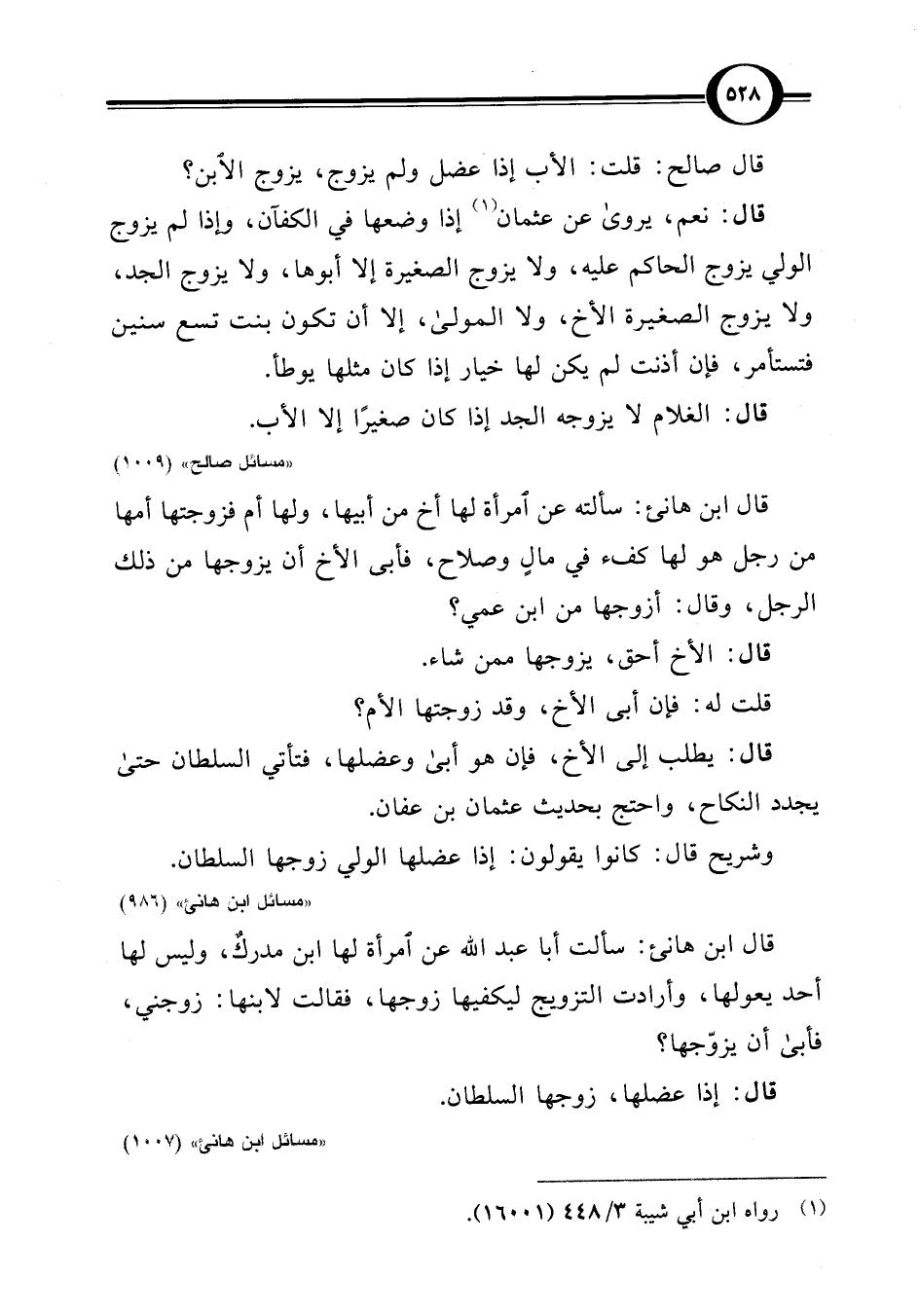 قال ابن هانئ: سألته عن امرأة لها أخ من أبيها، ولها أم فزوجتها أمها من رجل هو لها كفء في مالٍ وصلاح، فأبى الأخ أن يزوجها من ذلك الرجل، وقال: أزوجها من ابن عمي؟