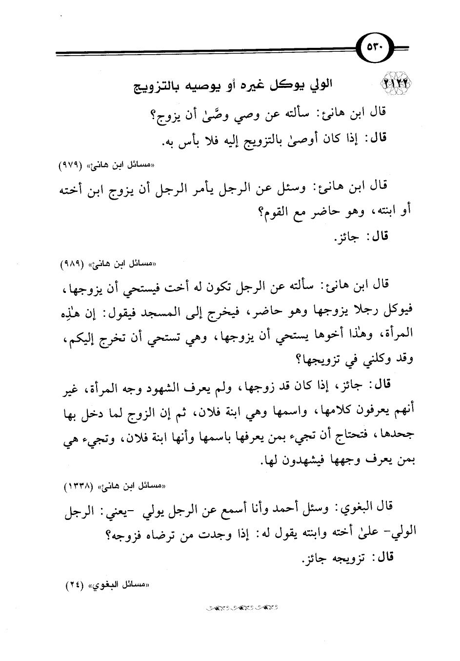قال ابن هانئ: سألته عن الرجل تكون له أخت فيستحي أن يزوجها، فيوكل رجلا يزوجها وهو حاضر، فيخرج إلى المسجد فيقول: إن هذِه المرأة، وهذا أخوها يستحي أن يزوجها، وهي تستحي أن تخرج إليكم، وقد وكلني في تزويجها؟