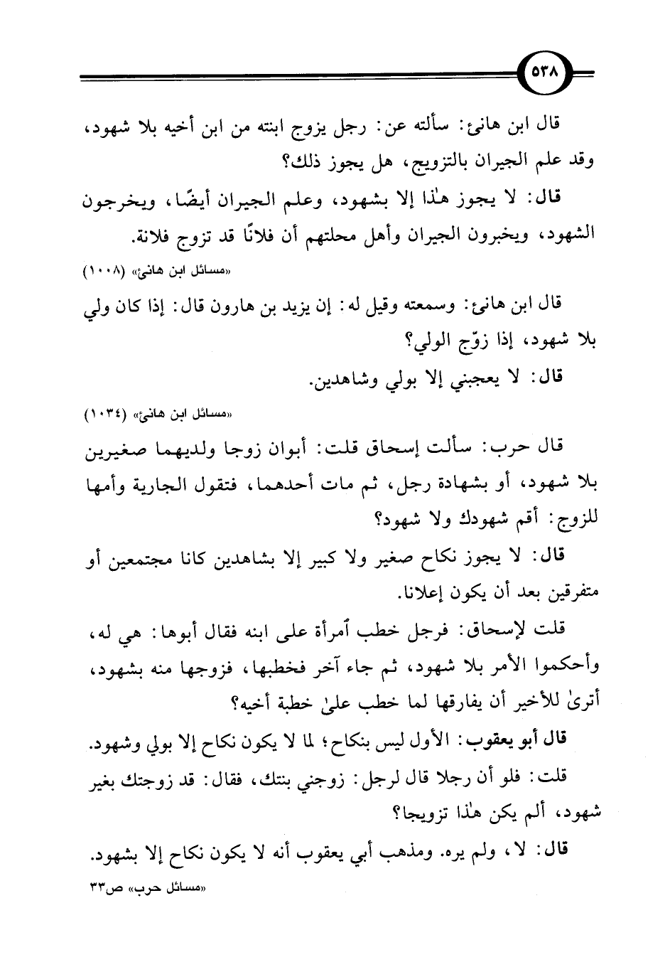 قال ابن هانئ: وسمعته وقيل له: إن يزيد بن هارون قال: إذا كان ولي بلا شهود، إذا زوّج الولي؟