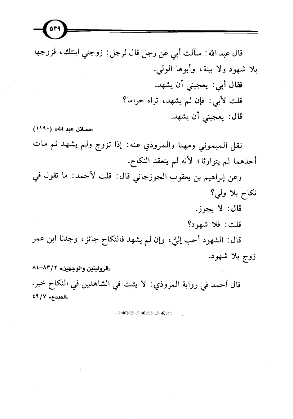 وعن إبراهيم بن يعقوب الجوزجاني قال: قلت لأحمد: ما تقول في نكاح بلا ولي؟