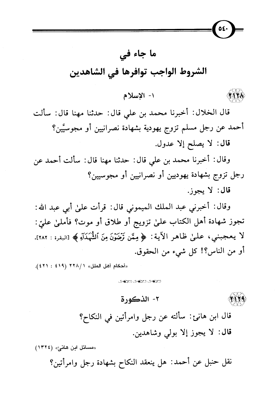 وقال: أخبرنا محمد بن علي قال: حدثنا مهنا قال: سألت أحمد عن رجل تزوج بشهادة يهوديين أو نصرانيين أو مجوسيين؟