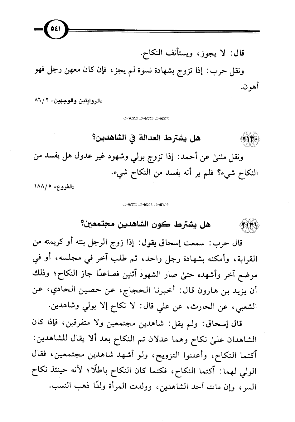 قال حرب: سمعت إسحاق يقول: إذا زوج الرجل بنته أو كريمته من القرابة، وأمكنه بشهادة رجل واحد، ثم طلب آخر في مجلسه، أو في موضع آخر وأشهده حتى صار الشهود اثنين فصاعدًا جاز النكاح؛ وذلك أن يزيد بن هارون قال: أخبرنا الحجاج، عن حصين الحادي، عن الشعبي، عن الحارث، عن علي قال: لا نكاح إلا بولي وشاهدين.