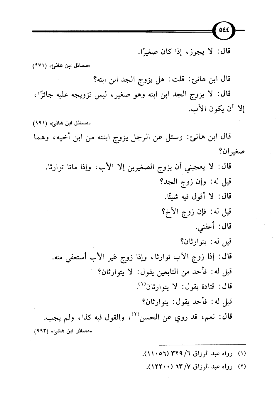 قال ابن هانئ: وسئل عن الرجل يزوج ابنته من ابن أخيه، وهما صغيران؟
