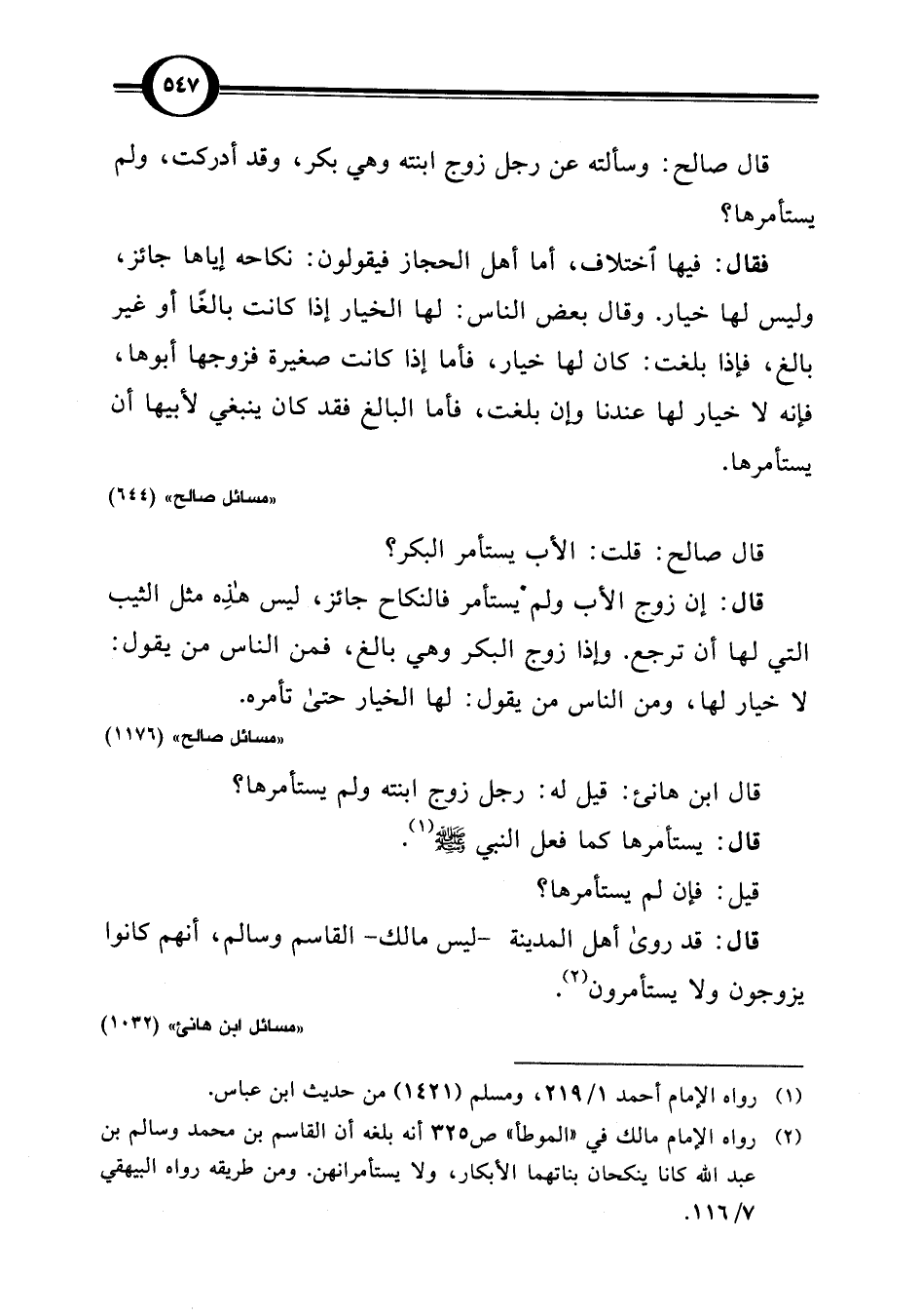 (¬2) رواه الإمام مالك في "الموطأ" ص 325 أنه بلغه أن القاسم بن محمد وسالم بن عبد اللَّه كانا ينكحان بناتهما الأبكار، ولا يستأمرانهن. ومن طريقه رواه البيهقي 7/ 116.