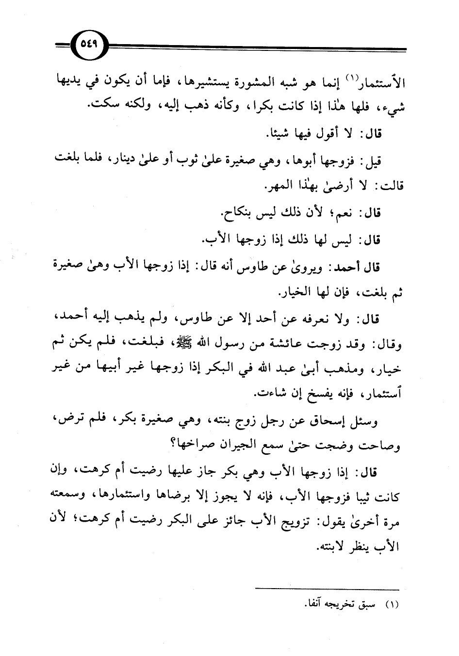 قال: ولا نعرفه من أحد إلا عن طاوس، ولم يذهب إليه أحمد، وقال: وقد زوجت عائشة من رسول اللَّه -صلى اللَّه عليه وسلم-، فبلغت، فلم يكن ثم خيار، ومذهب أبي عبد اللَّه في البكر إذا زوجها غير أبيها من غير استئمار، فإنه يفسخ إن شاءت.
