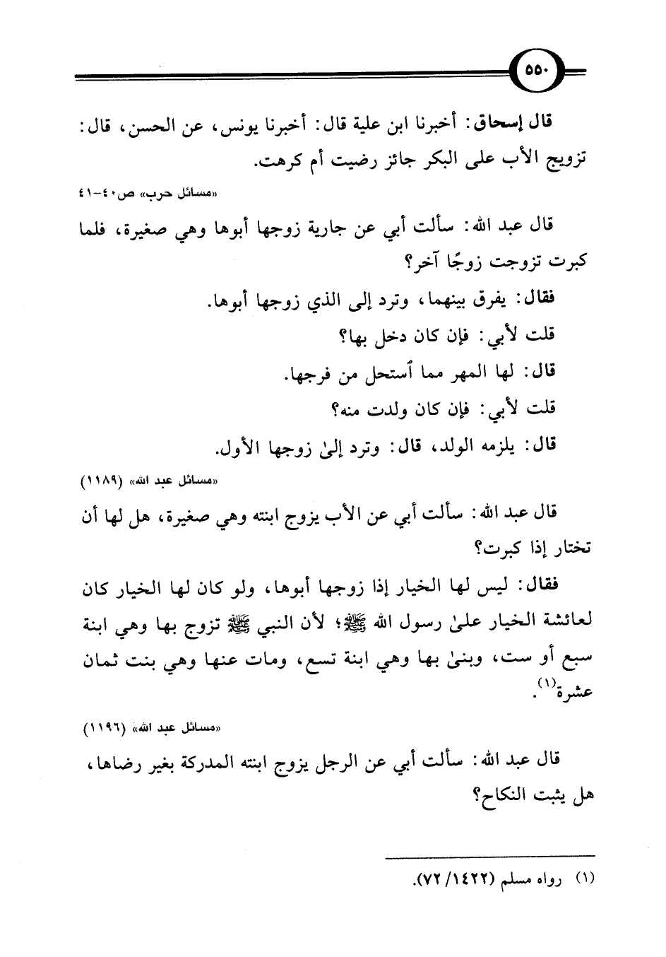 قال عبد اللَّه: سألت أبي عن الرجل يزوج ابنته المدركة بغير رضاها، هل يثبت النكاح؟