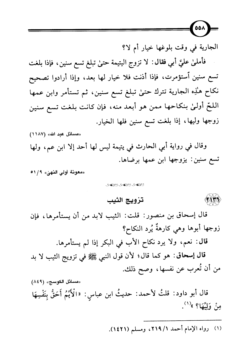 فأملى عليَّ أبي فقال: لا تزوج اليتيمة حتى تبلغ تسع سنين، فإذا بلغت تسع سنين استؤمرت، فإذا أذنت فلا خيار لها بعد، وإذا أرادوا تصحيح نكاح هذِه الجارية تترك حتى تبلغ تسع سنين، ثم تستأمر وابن عمها اللحّ أولى بنكاحها ممن هو أبعد منه، فإن كانت بلغت تسع سنين زوجها وليها، إذا بلغت تسع سنين فلها الخيار.