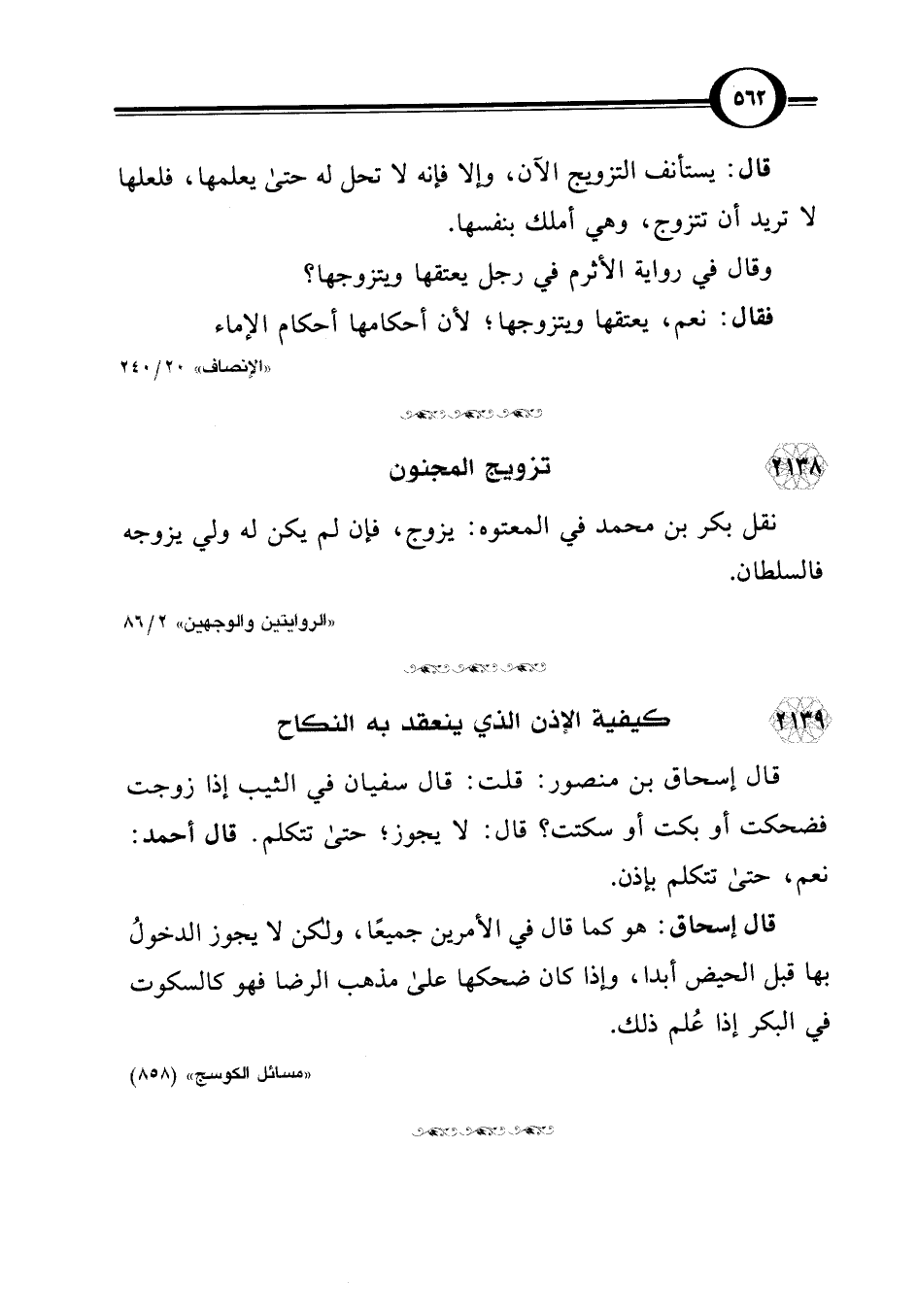 قال إسحاق بن منصور: قلت: قال سفيان في الثيب إذا زوجت فضحكت أو بكت أو سكتت؟ قال: لا يجوز؛ حتى تتكلم. قال أحمد: نعم، حتى تتكلم بإذن.